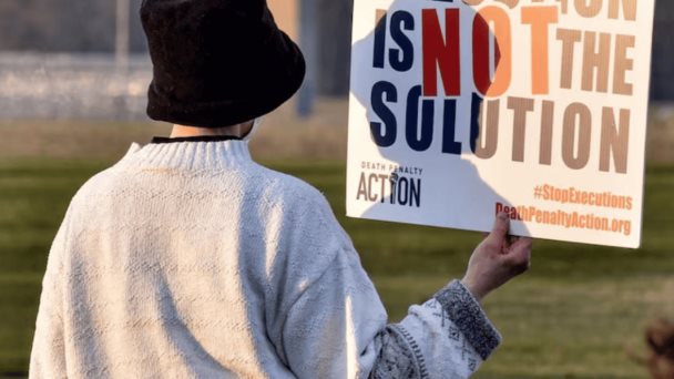 Un activista sujeta un cartel contra la pena capital en Terre Haute (Indiana) a finales de 2020, cuando Trump ordenó que se reanudaran las ejecuciones de presos en el corredor de la muerte federal.