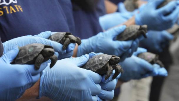 Especialistas en cuidado animal que las han vigilado desde que eran huevos sostuvieron a los animales en un camino junto al hábitat de tortugas del zoológico. Las crías de esta especie amenazada están comiendo bien y creciendo, de acuerdo con reportes.