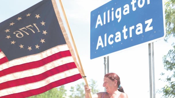 Rana Mourer ondea una bandera estadounidense fuera del centro de detención de inmigrantes conocido como "Alcatraz de los Caimanes" en la instalación de Entrenamiento y Transición de Dade-Collier, Florida.