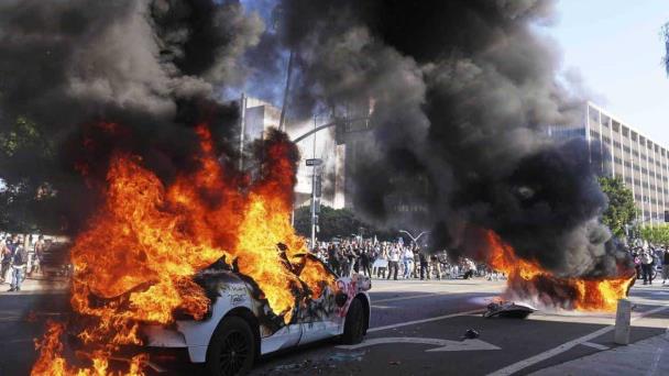 Miles de manifestantes ingresan al centro de Los Ángeles, cierran vía rápida y queman vehículos autónomos.
