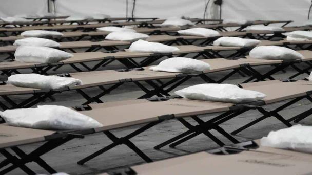 Bolsas con ropa de cama sobre varios catres en la carpa-domitorio, en un recorrido de un refugio en la ciudad de Nueva York, acondicionado para alojar hasta 1.000 migrantes en el distrito de Queens, en Nueva York.