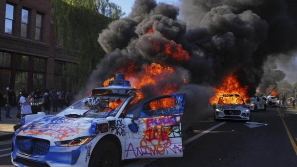 Cerca, al menos cuatro autos autónomos de Waymo fueron incendiados, lo que provocó grandes columnas de humo negro y explosiones intermitentes de los vehículos eléctricos. Al caer la noche, la policía había emitido una orden de asamblea ilegal cerrando varias cuadras del centro de Los Ángeles.