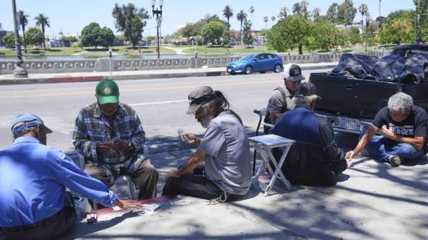 Varias personas juegan cartas en una acera del Parque MacArthur, el martes 8 de julio de 2025, en Los Ángeles.