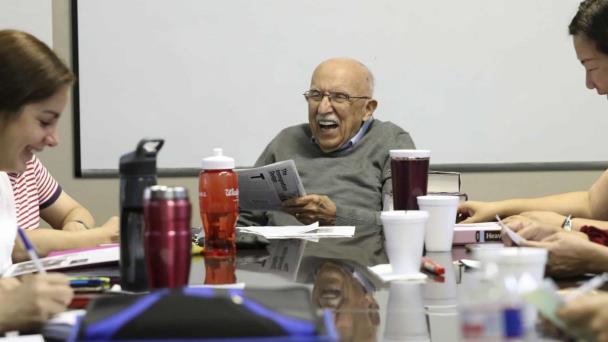 El instructor Vito Susca comparte un momento con su clase de inglés, como segundo idioma en el Consejo de Alfabetización de Fort Bend en Sugar Land, Texas.