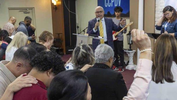 El reverendo Esteban Rodriguez, con su congregación en el centro cristiano "El Pan de Vida", en Kissimmee, Florida