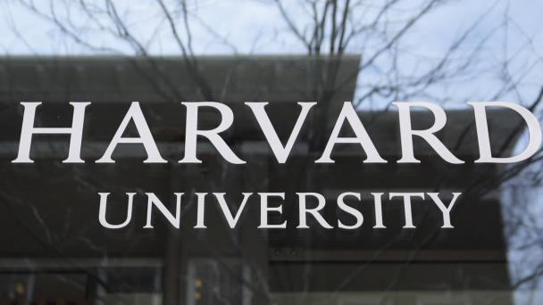 El logo de la Universidad Harvard se observa en un edificio de la universidad en Cambridge.