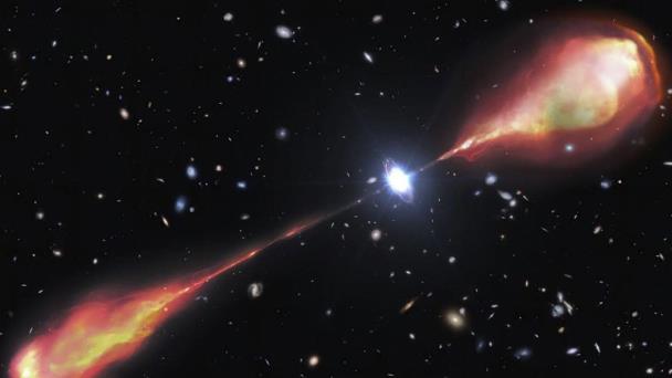 Descubierto hace apenas unos años, el cuásar que alimenta este chorro se formó cuando el universo tenía apenas 9% de su edad actual, dentro de los primeros 1.200 millones de años.