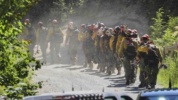 Un grupo de bomberos se presentan al lugar en donde el día anterior un hombre armado emboscó y mató a varios bomberos que respondían a un incendio forestal en la montaña Canfield, en Coeur D´Alene, Idaho.