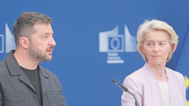 La presidenta de la Comisión Europea, Ursula von der Leyen, derecha, y Volodymyr Zelenskyy, participan en una conferencia en la sede de la UE en Bruselas.