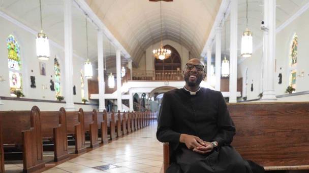 El reverendo Ajani K. Gibson, pastor de la iglesia San Pedro Claver, ubicada en el Distrito 7, vecindario donde vivieron los abuelos del ahora papa León XIV, habla en entrevista a The Associated Press dentro de la iglesia, en Nueva Orleans.