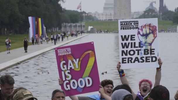 Activistas LGBTQ+ levantan sus voces en un mitin que precede a una marcha de protesta en Washington.