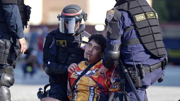 Un manifestante es sometido por elementos federales durante una de las protestas.