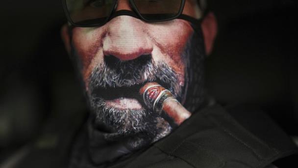 Un agente de Inmigración se cubre el rostro con una mascarilla con la imagen de un habano y barba mientras espera trasladar a inmigrantes detenidos en Baldwin Park, California.