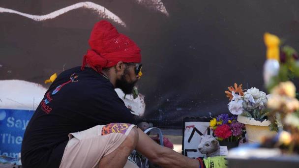Detrius Smith, oriundo de Dallas, que visitó el sitio conmemorativo de Floyd junto con sus tres hijas y cinco nietos, le contó a una nieta sobre cómo personas de todo el mundo se unieron para denunciar la injusticia racial después del asesinato de Floyd.