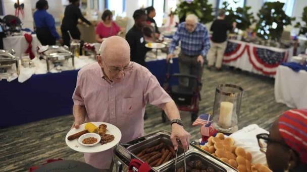 Un anciano se sirve del buffet por el Día de la Independencia de Estados Unidos en la residencia para ancianos "Toby and Leon Cooperman Sinai Residences", en Boca Ratón, Florida.