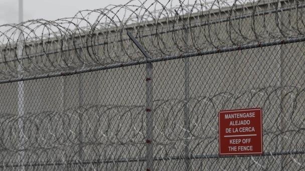 Un letrero de advertencia en inglés y español cuelga en una valla de alambre de púas de un patio de recreo utilizado por detenidos.