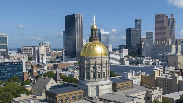 El domo de oro del Capitolio de Georgia brilla bajo la luz del sol, el 27 de agosto de 2022, en el centro de Atlanta.