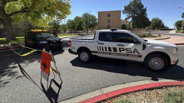Las autoridades bloquean el acceso a un área cercana al complejo de viviendas estudiantiles de la Universidad de Nuevo México donde dos personas fueron baleadas, una de ellas fatalmente, en la madrugada del viernes 25 de julio de 2025 en Albuquerque, Nuevo México.