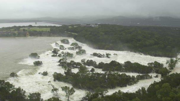Un torrente de agua se desborda a través del desagüe del lago Canyon, cerca de New Braunfels, Texas, el viernes 5 de julio de 2002, sumándose a la crecida del río Guadalupe.