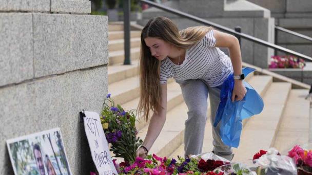 Claire Stein coloca flores en un monumento improvisado para la representante estatal de Minnesota, Melissa Hortman, y su esposo Mark.