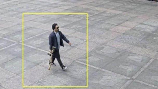 En esta imagen de un video de vigilancia, obtenido por The Associated Press, se muestra a Shane Tamura afuera de un edificio de oficinas de Manhattan el lunes, en Nueva York.