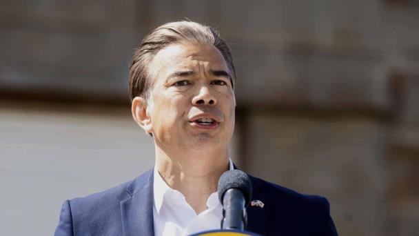El fiscal general de California, Rob Bonta, en conferencia de prensa en Ceres, California.
