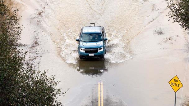 Un vehículo circula por un camino inundado por las fuertes lluvias, el lunes 22 de diciembre de 2025, en Redding, California.