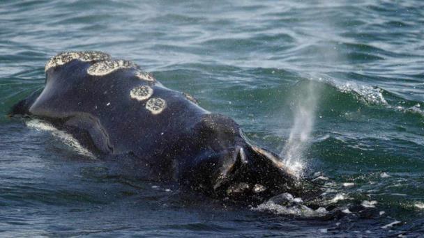 Se trata de la ballena franca del Atlántico Norte, de la cual solo quedan alrededor de 370. Las ballenas dan a luz en el sureste de Estados Unidos en invierno y primavera y migran hacia el norte a Nueva Inglaterra y Canadá para alimentarse.