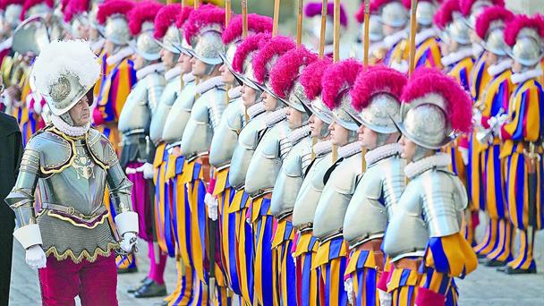 León se sentó en un trono situado en un patio del Palacio Apostólico mientras los nuevos guardias, con sus distintivos uniformes de gala amarillos, azules y rojos, levantaban el brazo derecho en un saludo de tres dedos y prometían defenderlo y servirlo "con todas mis fuerzas, sacrificio y, si es necesario, mi vida".