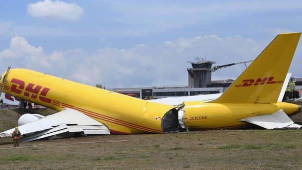 Un avión de carga de la empresa DHL derrapó en la pista del aeropuerto más importante de Costa Rica y se partió en dos, lo que ocasionó el cierre total de la terminal aérea.