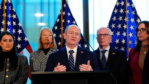El senador Chris Coons, del Partido Demócrata, ofrece una conferencia de prensa con la delegación estadounidense de senadores.