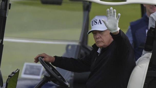 Trump y su hijo Eric jugaron con el embajador de Estados Unidos en Reino Unido, Warren Stephens, cerca de Turnberry, un campo histórico que la empresa de la familia Trump asumió en 2014. La seguridad era estricta, y los manifestantes se mantuvieron a distancia y no fueron vistos por el grupo durante la ronda de Trump. Vestía de negro, con una gorra blanca con las letras "USA" ("EEUU" en inglés), y fue visto conduciendo un carrito de golf.