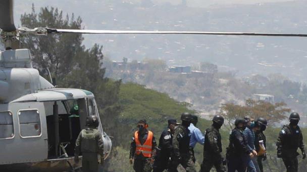 EL EXPRESIDENTE JUAN ORLANDO HERNÁNDEZ, a la derecha, es escoltado esposado por soldados y policías al ser trasladado a una base de la Fuerza Aérea en Tegucigalpa.