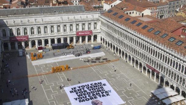 Unos seis manifestantes desplegaron una pancarta gigante temprano el lunes en la Plaza de San Marcos que decía: "SI PUEDES ALQUILAR VENECIA PARA TU BODA, PUEDES PAGAR MÁS IMPUESTOS". La policía local rápidamente la dobló y se la llevó.