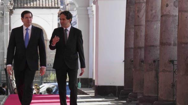 El presidente de Ecuador, Daniel Noboa, agradeció el jueves a Rubio por los esfuerzos de Estados Unidos para "eliminar realmente cualquier amenaza terrorista". Antes de su reunión, Rubio había dicho en las redes sociales que Estados Unidos y Ecuador están "alineados como socios clave para poner fin a la inmigración ilegal y combatir el crimen transnacional y el terrorismo".