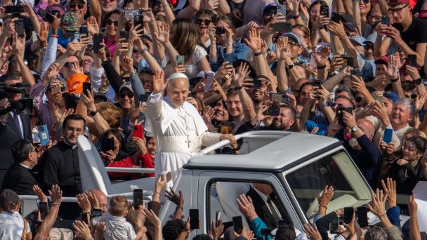 Inició, oficialmente, su pontificado con su primer recorrido en papamóvil por la plaza, un rito de paso que se ha convertido en sinónimo del alcance global del papado y su atractivo mediático. El misionero agustino, de 69 años, sonrió y saludó desde la parte trasera del vehículo y se detuvo para bendecir a algunos bebés en la multitud.