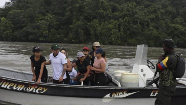 Los secuestrados llegaron en la mañana del viernes en una lancha por un río del Cauca custodiados por hombres armados que vestían trajes camuflados con brazaletes de la "Columna Alex Guerrero" poco antes de ser liberados, según corroboró en el lugar The Associated Press.
