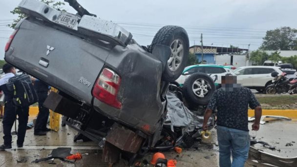 Como resultado del choque, la camioneta Mitsubishi volcó sobre la vialidad en dirección Cancún–Aeropuerto.