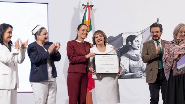 En el marco del Día Nacional de la Enfermería, la Jefa del Ejecutivo Federal entregó el Reconocimiento al Mérito en Enfermería 2025 a las enfermeras Juana Jiménez Sánchez, jubilada del IMSS; a la profesora titular de la Facultad de Enfermería de Nuevo León, Yolanda Flores Peña y a la directora del Instituto Nacional de Cardiología, Sandra Sonalí Olvera Arreola