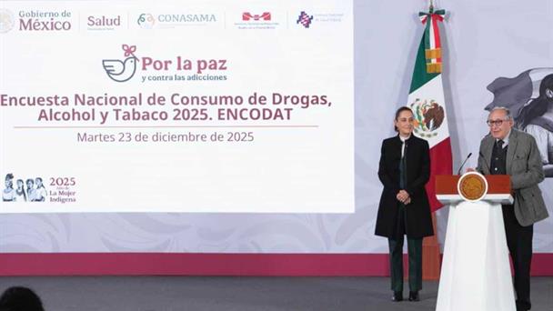 La Presidenta de México, Claudia Sheinbaum Pardo, resaltó que los resultados de la Encuesta Nacional de Consumo de Drogas, Alcohol y Tabaco (ENCODAT) 2025, que realizó el Instituto Nacional de Salud Pública (INSP) de la Secretaría de Salud, demuestran que es exitosa la campaña preventiva, nacional y permanente Aléjate de las drogas. El fentanilo te mata, ya que el consumo no médico de este opioide disminuyó de 0.2 a 0.1 por ciento, mientras que el uso experimental de drogas ilegales en adolescentes se redujo del 6.2 por ciento en 2016 a 4.1 por ciento en 2025.