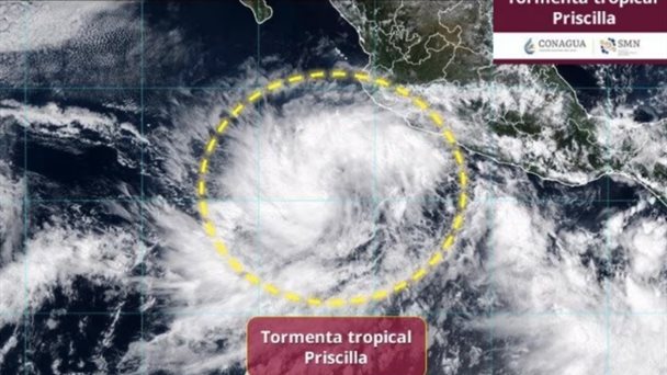 El huracán Priscilla se desplaza frente a la costa de México a unos 338 kilómetros (210 millas) al suroeste de Cabo Corrientes, con vientos máximos sostenidos de 140 km/h (85 mph).