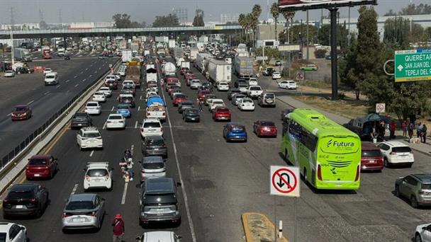 Este miércoles 31 de diciembre se registró un congestionamiento vial en la caseta de cobro de la autopista México-Querétaro, en dirección a Querétaro, debido al aumento del tránsito por el cierre de año. La fila de vehículos inicia aproximadamente 400 metros antes de la plaza de cobro, e incluye automóviles, autobuses de pasajeros, transporte público y unidades de carga.