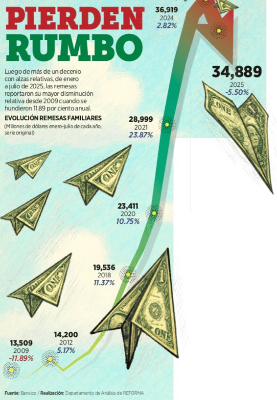 En los primeros siete meses de 2025, los flujos de remesas padecieron su mayor revés en 16 años al caer 5.50 por ciento anual, a 34 mil 889 millones de dólares, revelaron datos del Banco de México (Banxico).