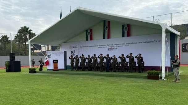 El oficial mayor de la Secretaría de la Defensa Nacional (Sedena) Enrique Martínez López realizó la imposición de insignias en el estadio de fútbol "Sargento Pedraza".