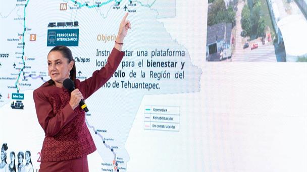 CIUDAD DE MÉXICO.- La Presidenta de México, Claudia Sheinbaum Pardo, destacó que el Tren Interoceánico es muy importante para el desarrollo del sureste del país, ya que permite la movilidad de personas y mercancías, además de que se construyen Polos de Desarrollo Económico para el Bienestar (PODECOBI), esto luego de inaugurar el viernes el tramo 1 de la Línea K "Istmo-Soconusco".