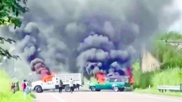 Versiones en esa ruta y lugareños indicaron que grupos del crimen organizado bloquearon la carretera y quemaron vehículos tras la presunta captura de un líder criminal que operaba en la zona.