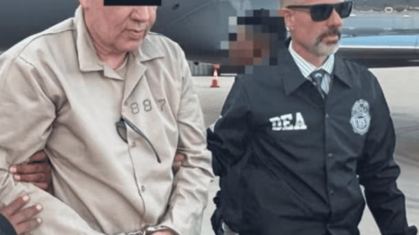 La agencia antidrogas difundió este jueves una fotografía en la que se ve que el funcionario policial lleva bajo custodia al cuñado del líder del Cártel Jalisco Nueva Generación (CJNG), Nemesio Oseguera Cervantes, "El Mencho", en conjunto con un agente de la Secretaría de Seguridad y Protección Ciudadana (SSPC), tras bajar del avión de la Fuerza Aérea Mexicana, que lo trasladó a los Estados Unidos.