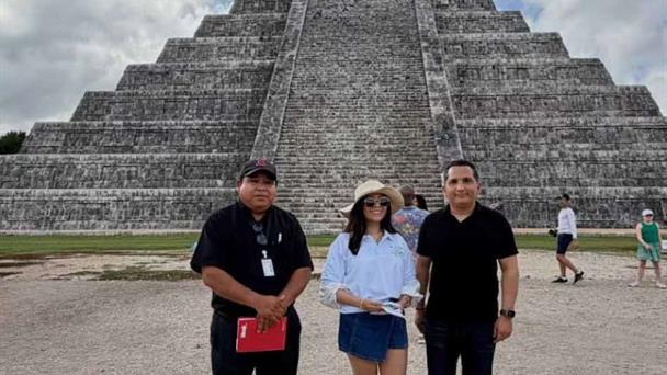 El acto se llevó a cabo en el parador turístico de Chichén Itzá, donde Jairo Suaste Salazar, director jurídico del sitio, y Jorge Carrillo Sáenz, presidente del Consejo Empresarial Turístico de Yucatán, entregaron a la joven una camiseta conmemorativa y la acompañaron en un recorrido guiado por la ciudad sagrada maya y el museo del lugar.