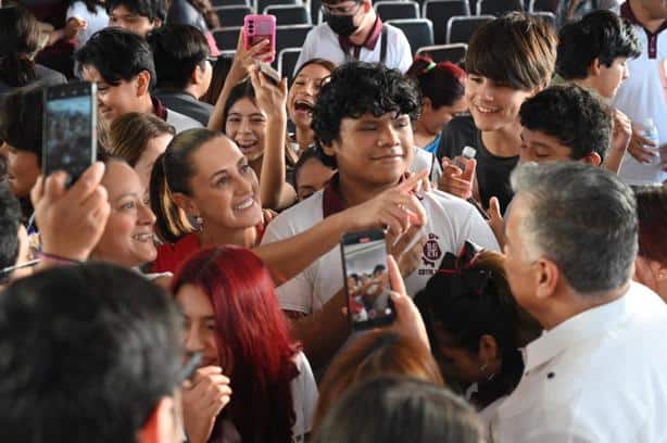 En asamblea con estudiantes del nivel medio superior, la primera mandataria entregó becas para el Bienestar Benito Juárez, tras realizar un recorrido en la construcción del CBTIS 305 en Mérida.