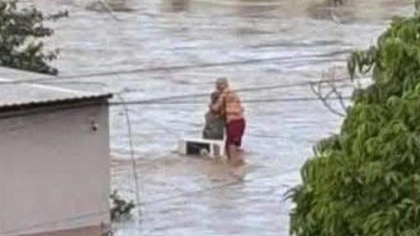 La imagen que circuló en redes sociales fue de ellos dos arriba de un compresor de un aire acondicionado mientras trataban de sobrevivir a la furia del agua que casi los cubría.